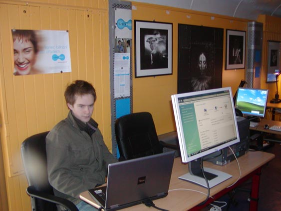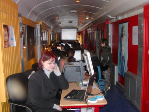 Celkový pohled do NET vlaku s počítačovou učebnou a s pracovištěm Czech POINT v popředí